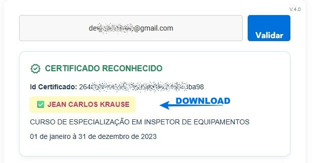 Após clicar em VALIDAR, nosso sistema vai buscar em nosso banco de dados, VALIDAR E GERAR um certificado para download, essa ação pode demorar até um minuto, por favor aguarde, isso é para garantirmos a segurança dos dados, obrigado.
